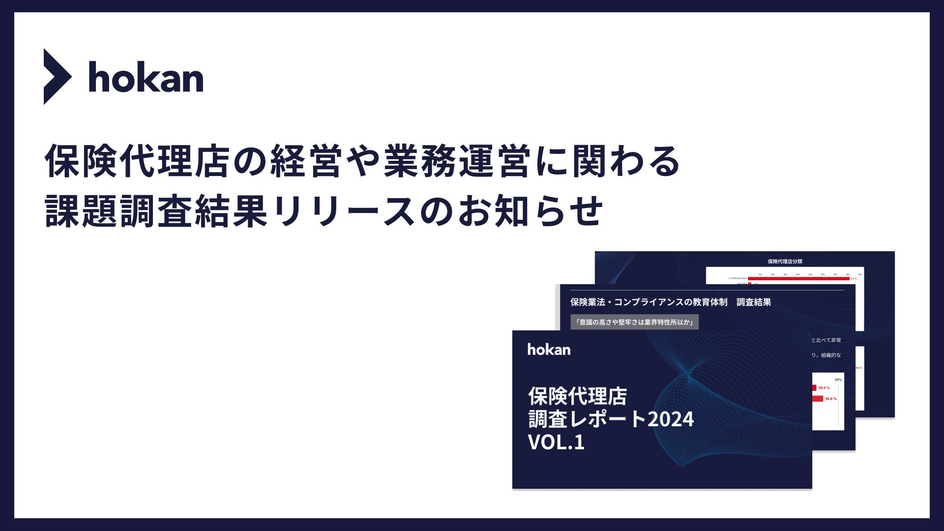 「適正な営業活動」と「組織の強固な監査体制」を実現するクラウド型保険代理店システム「hokan®︎」を提供する株式会社hokan(ホカン、本社:東京都中央区、代表取締役:小坂直之、以下:当社)は、2024年1月に実施した保険代理店における経営と業務運営に関わる課題調査について、集計結果をまとめた調査レポートをリリースしたことをお知らせいたします。