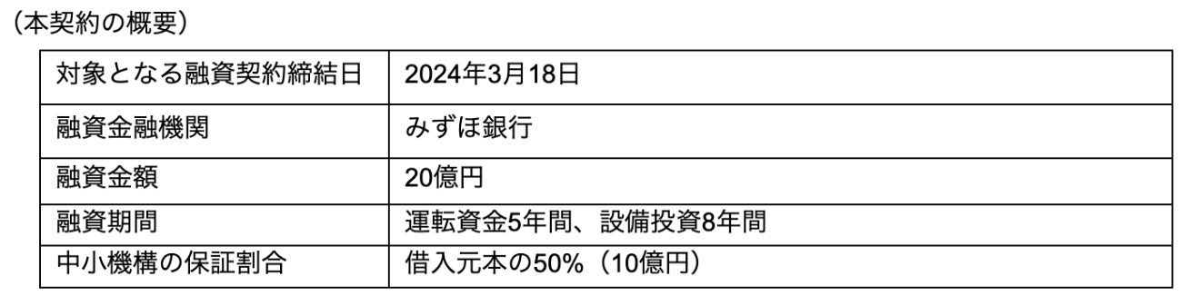 TBMは、本契約に先立ち、経済産業省から革新的技術研究成果活用事業活動計画の認定を受けました。これにより、中小機構の債務保証制度において、保証率(借入元本の50%)の適用を受け、みずほ銀行と総額20億円のローン契約を締結しました。