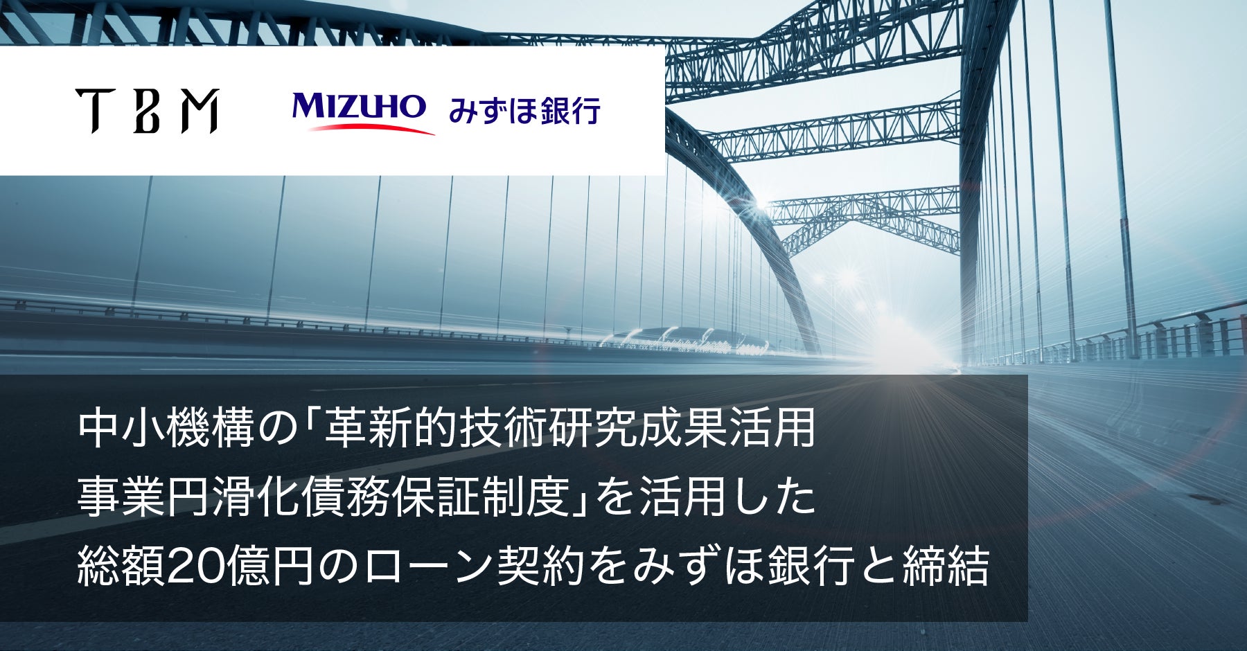 TBMは、本契約に先立ち、経済産業省から革新的技術研究成果活用事業活動計画の認定を受けました。これにより、中小機構の債務保証制度において、保証率(借入元本の50%)の適用を受け、みずほ銀行と総額20億円のローン契約を締結しました。