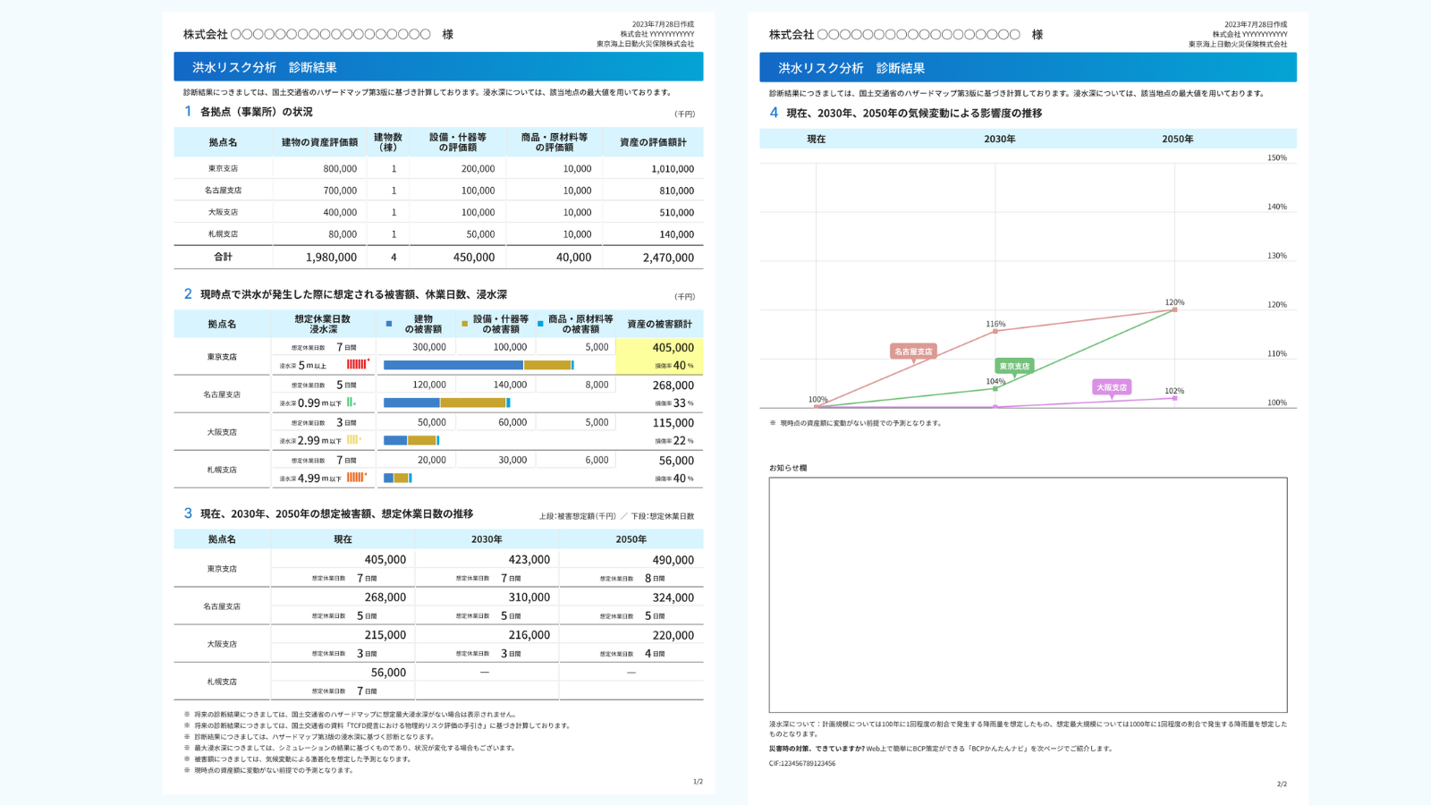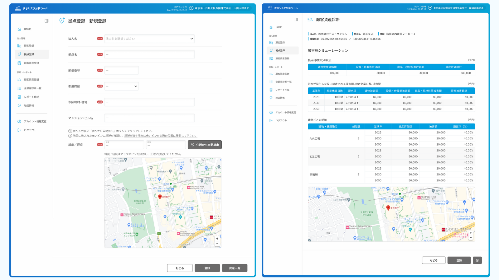 法人のお客様の拠点の建物資産(ビル、倉庫)、設備・什器等評価額や商品・原材料等評価額を登録いただきます(拠点については、Googleマップの地図情報を参照して、位置を確認することも可能です)。診断ボタンを押下すると、現在・2030年・2050年で洪水が発生した際の想定被害額や想定休業日数が計算されます。診断した結果はPDFで、レポートとしてお客様にご提出することができます。