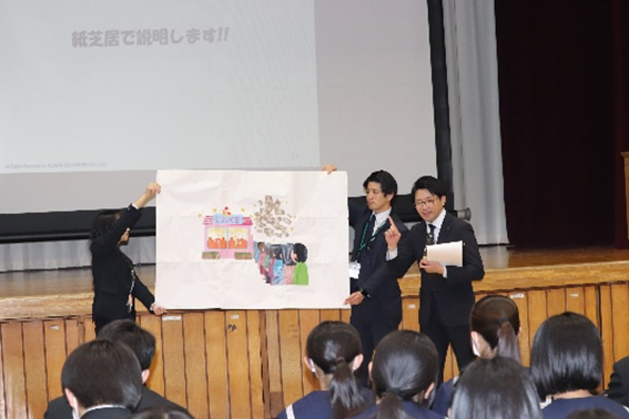 後半パートでは、信用金庫から間接金融、証券会社から直接金融について、紙芝居を交えながら、企業の資金調達の流れを楽しく学びました。授業の最後には、金融機関に対する質問も受け付けました。金融機関の仕事に興味津々な生徒が多く、当社千住支店長からは金融機関、証券会社の魅力について回答させていただき、キャリア教育にも資する授業となりました。