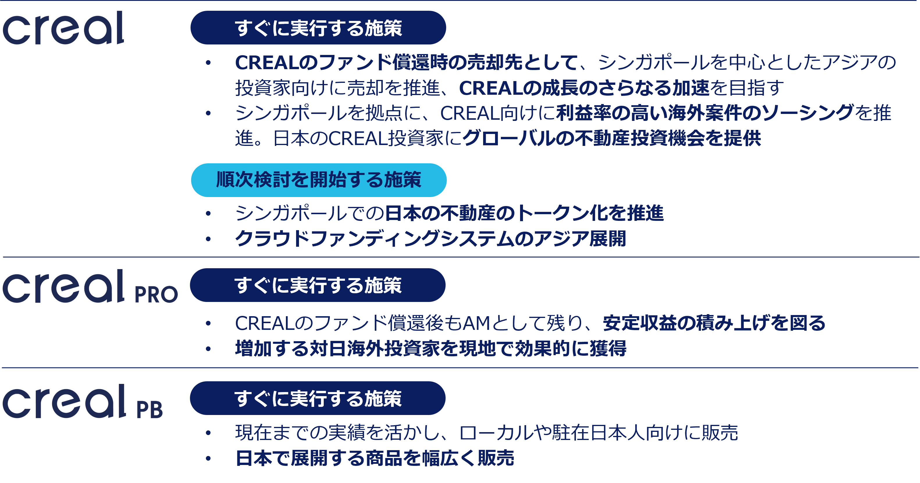 このたびの取引はCREAL ASIA設立以降、新たな海外投資家とのリレーションの構築を図ることにより受託に至った第1号案件であり、当社グループのグローバル展開の着実な進展を示すものとなっております。海外投資家の対日不動産投資ニーズは底堅く推移している中で、当社グループはグローバルでのビジネスチャンスを捉えながら、引き続き「不動産投資を変え、社会を変える。」というミッションの達成に向け、国内外の展開を図って参ります。