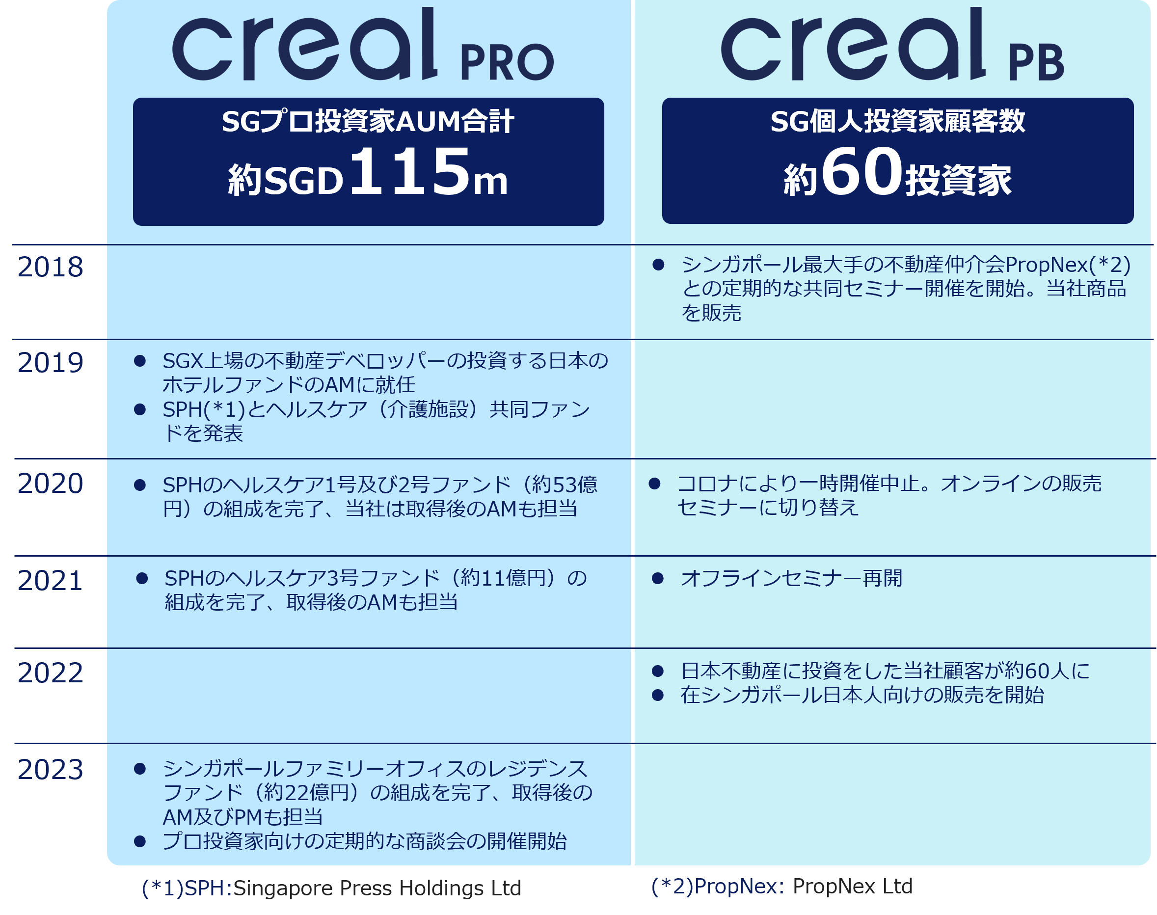 当社は、下段「当社グループのシンガポールでの実績」のとおり、2018年よりシンガポールからの対日不動産投資に関する取り組みを継続して参りました。この取り組みを更に強化すべく、アジアを拠点にしたグローバル展開を見据えたハブとして2023年11月、シンガポール現地にCREAL ASIAを設立するに至っております。