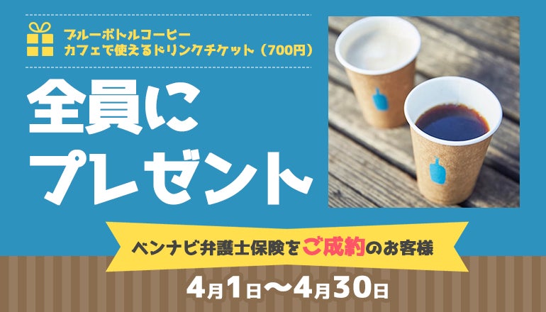 対象期間中に弁護士保険STATION経由で、株式会社アシロ少額短期保険「ベンナビ弁護士保険」の契約申込を完了し、ご契約が成立されたお客様全員に「ブルーボトルコーヒー カフェで使えるドリンクチケット(700円)」をプレゼントします。