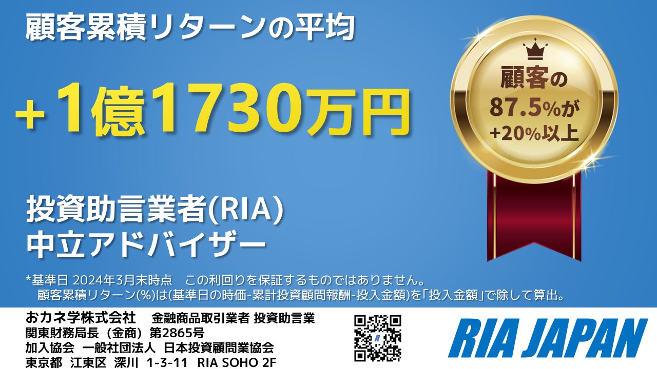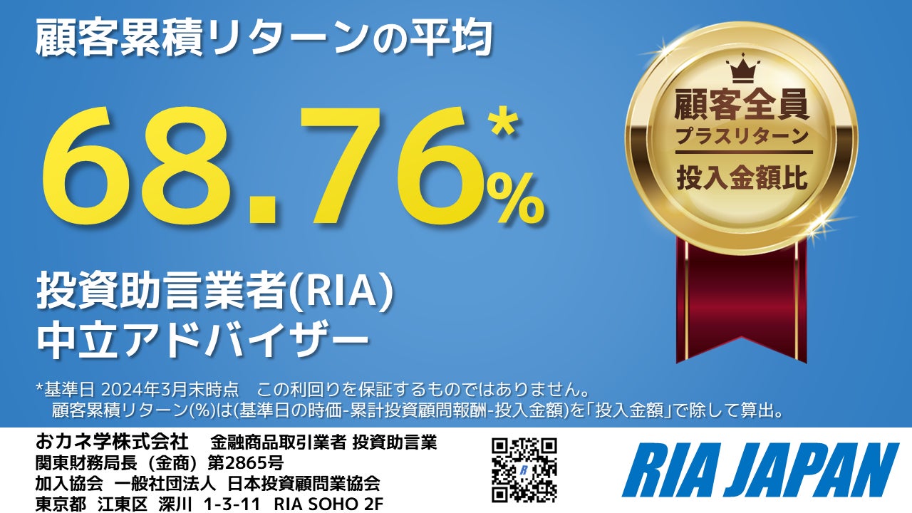 資産運用のアドバイスに特化する中立アドバイザーで、証券会社などから手数料・キックバック等を受け取らず、投資助言を提供するRIA JAPANは、2024年3月末時点での独自KPI「アドバイザーKPI」を公表しました(速報値)。