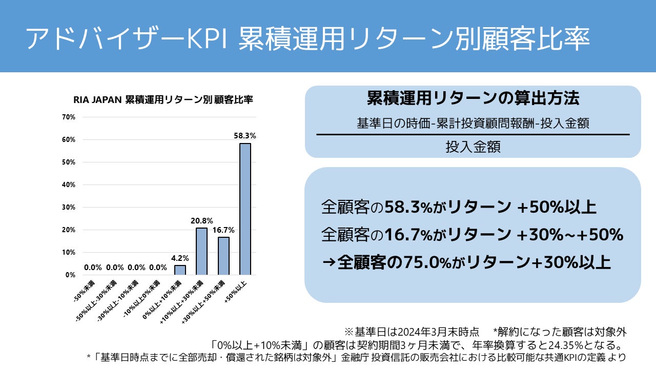 2. 全顧客の58.3%がリターン+50%以上、全顧客の75.0%がリターン+30%以上