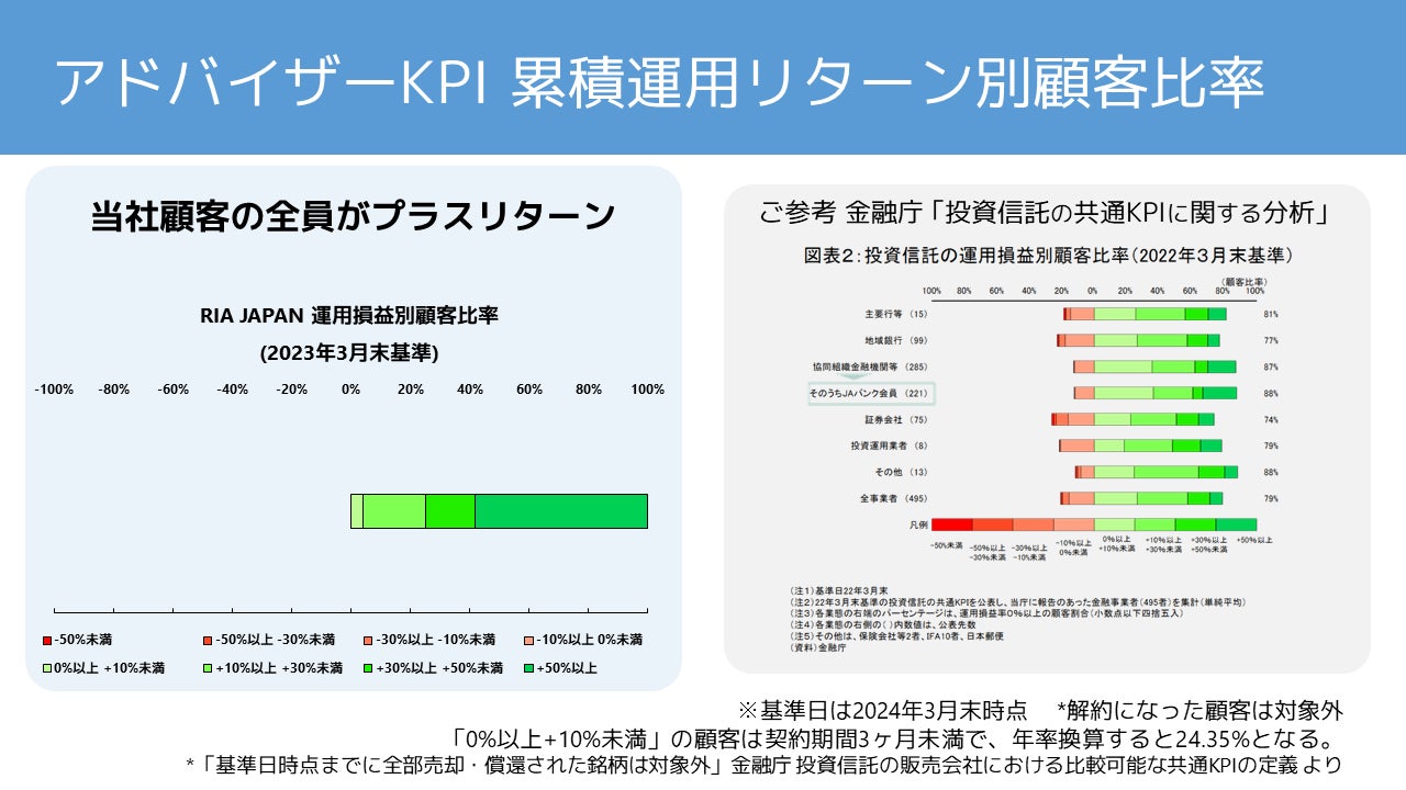 RIA JAPAN おカネ学株式会社は、投資助言業者もこの共通KPIのデータベースに参加すべきと考え、独自の「アドバイザーKPI」を策定しました。投資助言業者が受け取る「投資顧問報酬」の累計額も控除する形であり、投資信託の共通KPIと、ほぼ比較可能なデータであると考えております。また今後金融庁のデータベースにも他の金融事業者同様に掲載されることを期待するものです。