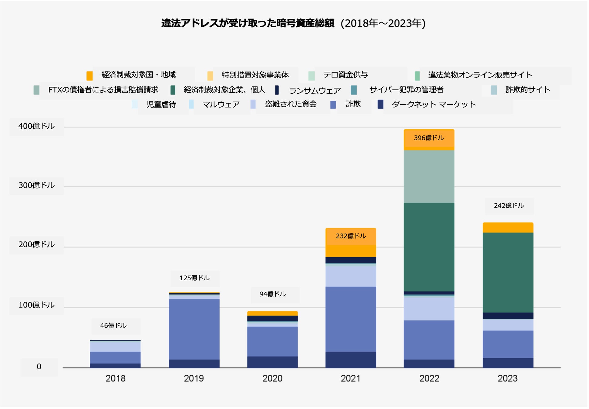 チェイナリシスが公開した暗号資産犯罪に関する最新の年次レポートにおいて、2023年に不正な取引を行う暗号資産アドレスが受け取った金額は242億ドルであり、これは過去最高を記録した2022年の396億ドルから大幅に減少したことが明らかになりました。これら不正取引のうち最大の金額を占めたものは、経済制裁対象者に関連するもので、149億ドルの取引が観測され、不正取引全体の61.5%を占めました。