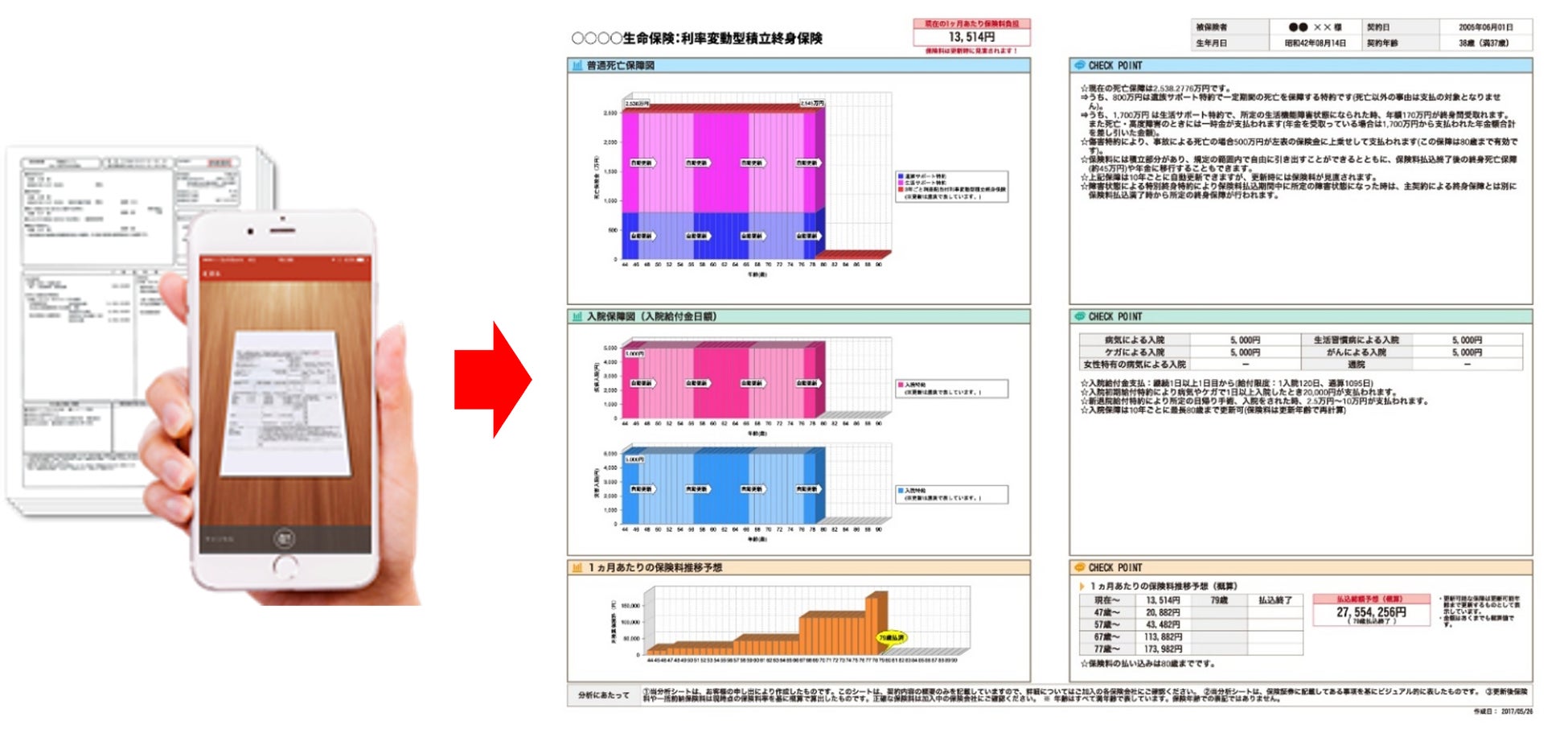当社が運営する来店型保険ショップ『保険クリニック®』で、お客様の保険証券をより短時間に正確に分析するため、生命保険の比較・分析システム「保険IQシステム®」の一機能として開発され、2018年6月に日本初のAI技術を活用し、「生命保険証券の自動分析サービス」がスタートしました。それまでは手入力していた保険証券を、AI-OCRで読み取るだけで分析できるようになりました。