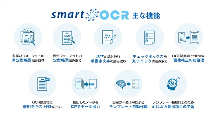 紙の文書や帳票をスキャン・撮影された画像データからテキストデータを抽出するクラウド型業務効率化支援ソリューションです。AI によるディープラーニングを活用し、従来のOCRでは難しかった手書き文字や非定型帳票などにも対応し高精度の読み取りを実現します。