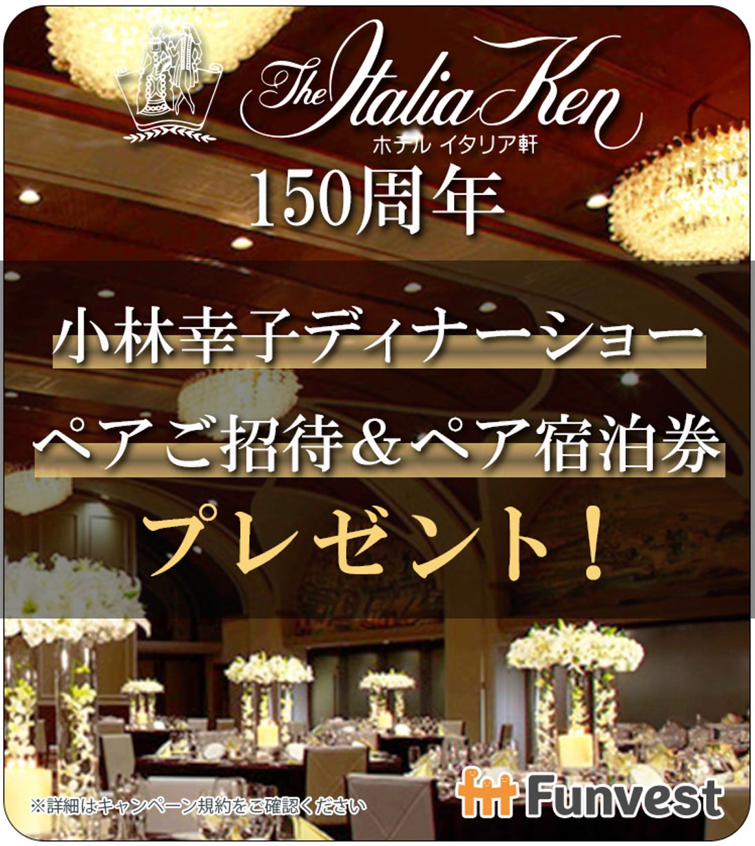 50万円以上ご出資の方で、本プレゼント希望者の中から抽選で5名様に「ホテルイタリア軒150周年『小林幸子ディナーショー』ペアご招待&ペア宿泊券」をプレゼント!