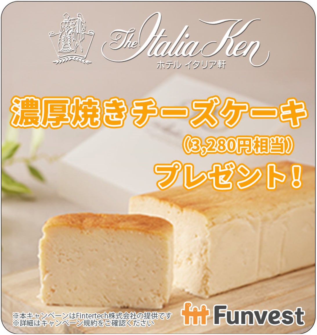 【A賞】300万円以上の出資でもれなく【B賞】抽選で5名様に「ホテルイタリア軒 濃厚焼きチーズケーキ」をプレゼント!