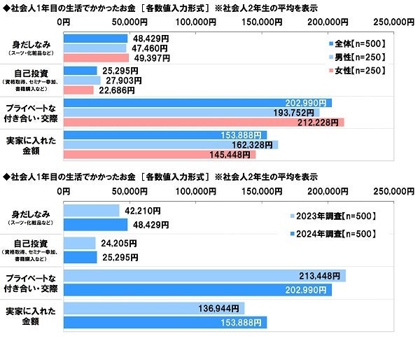 2024年春(4月)から働き始める社会人1年生500名と、就職してから1年が経つ社会人2年生500名に、社会人1年目のお金の使い方について質問しました。