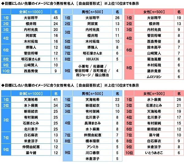 目標にしたい先輩のイメージに合う有名人を聞いたところ、男性有名人では1位「大谷翔平さん」、2位「櫻井翔さん」、3位「内村光良さん」となりました。メジャーリーグの大舞台で大記録を次々と打ち立てている大谷翔平さんを、目指すべき先輩像と考えている人が多いようです。