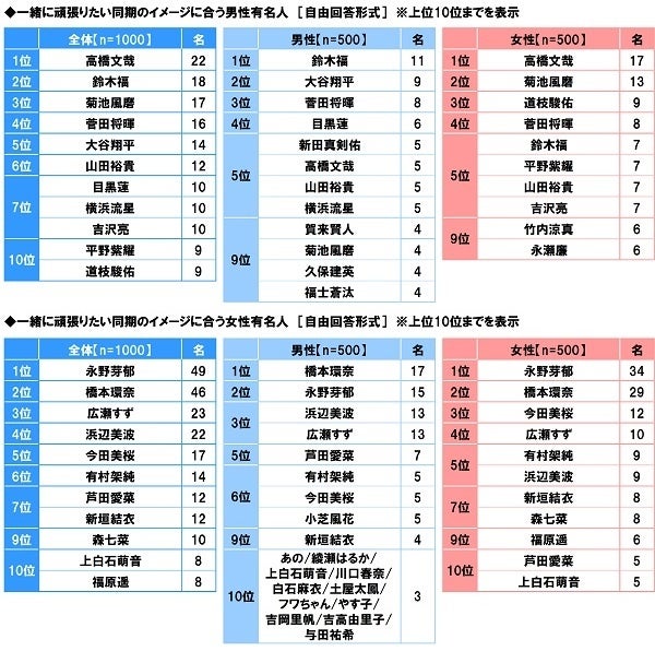 男女別にみると、男性回答では「鈴木福さん」が1位でした。子役としてブレイクし、現在は情報番組やバラエティでも活躍している鈴木福さんと一緒に働きたい男性が多いようです。女性回答では“なにわ男子”の「道枝駿佑さん」がTOP3にランクインしました。
