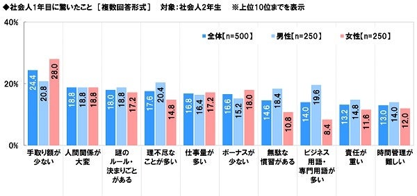 男女別にみると、「同期と愚痴の言い合いで盛り上がる」(男性16.8%、女性23.6%)は、男性と比べて女性のほうが5ポイント以上高くなりました。同期入社の同僚と愚痴をこぼし合ううちに、止まらなくなってしまった人が多いのではないでしょうか。「会社の独自ルールに驚く」(男性25.6%、女性14.4%)は、女性と比べて男性のほうが10ポイント以上高くなりました。