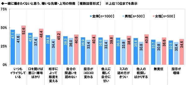全回答者(1,000名)に、一緒に働きたくないと思う、嫌いな先輩・上司の特徴を聞いたところ、「いつもイライラしている」(47.1%)が最も高くなりました。常に不機嫌そうな先輩・上司には好感を持てないという社会人1年生・2年生が多いようです。次いで高くなったのは、「口を開けば悪口・嫌味ばかり」(42.9%)、「相手によって態度を変える」(39.8%)、「自分の間違いを認めない」(38.3%)、「指示がコロコロ変わる」(36.9%)でした。