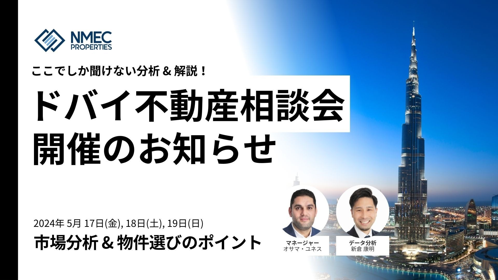5月17-19日、東京・大阪で少数スロット制のドバイ不動産相談会を開催。ドバイに精通したエージェントが来日し、他セミナーでは教えてくれない市場分析、価格上昇中のエリア、リスクの対処法まで解説します。