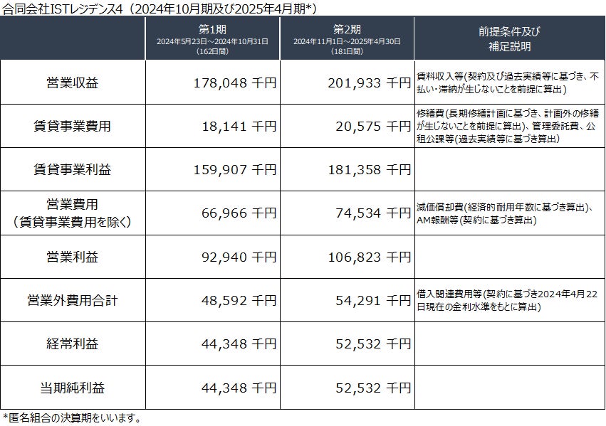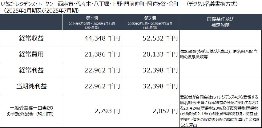「いちご・レジデンス・トークン -西麻布・代々木・八丁堀・上野・門前仲町・阿佐ヶ谷・金町-(デジタル名義書換方式)」の受益証券発行信託(以下、「本ファンド」という。)の委託者である合同会社IRS4は、本ファンドの発行者(委託者)として、2025年1月期(第1期)および2025年7月期(第2期)の業績予想(本資料公開日時点の予想)をお知らせいたします。