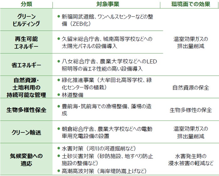 福岡県として昨年度に続き2回目のグリーンボンド発行となる本債券の調達資金は、福岡県が実施する「県有施設のZEB化」や「太陽光パネルの設置」「県有施設のLED照明更新」などの取組みに活用される予定です。