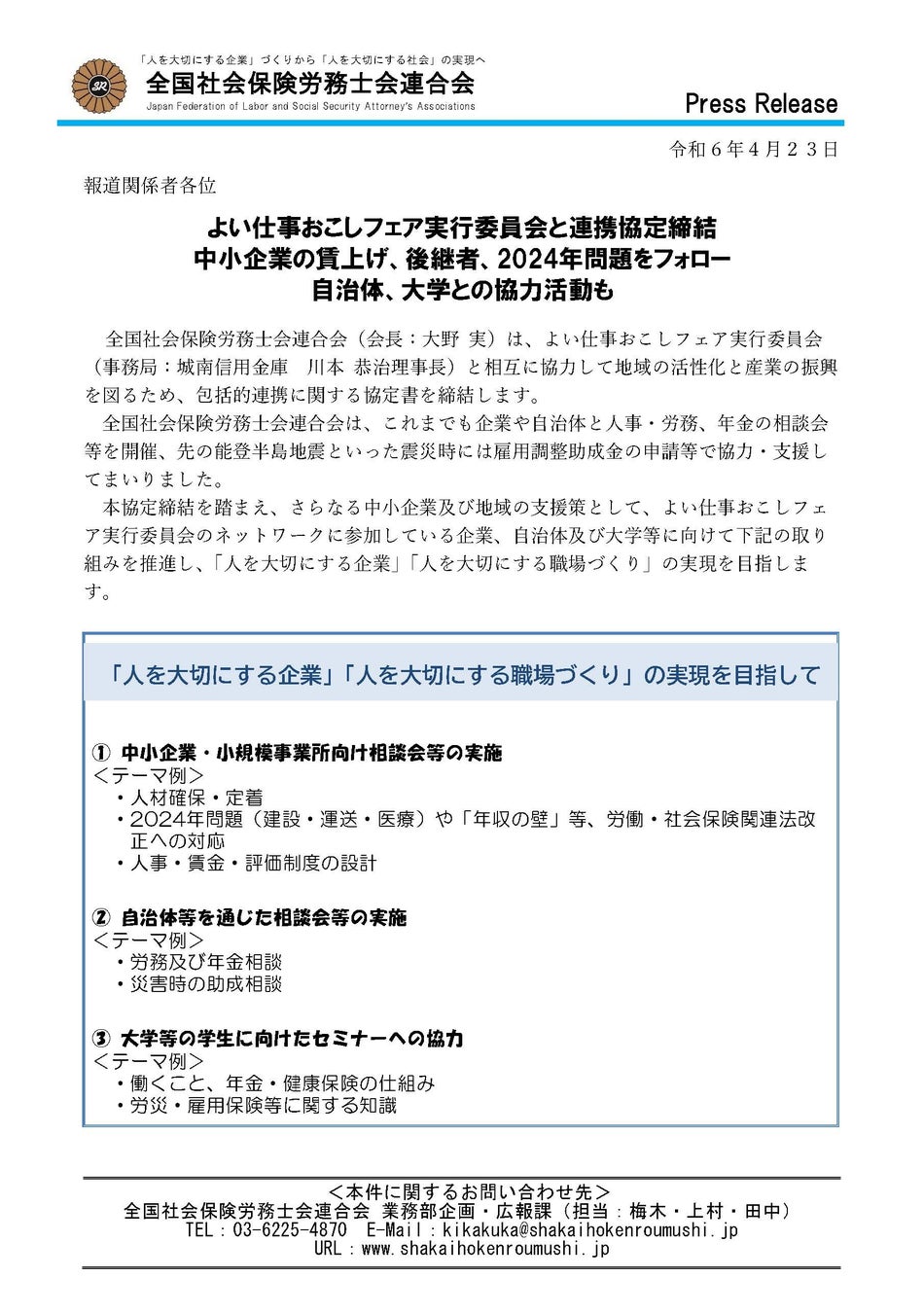 全国社会保険労務士会連合会(会長:大野 実)は、よい仕事おこしフェア実行委員会(事務局:城南信用金庫 川本 恭治理事長)と相互に協力して地域の活性化と産業の振興を図るため、包括的連携に関する協定書を締結します。
