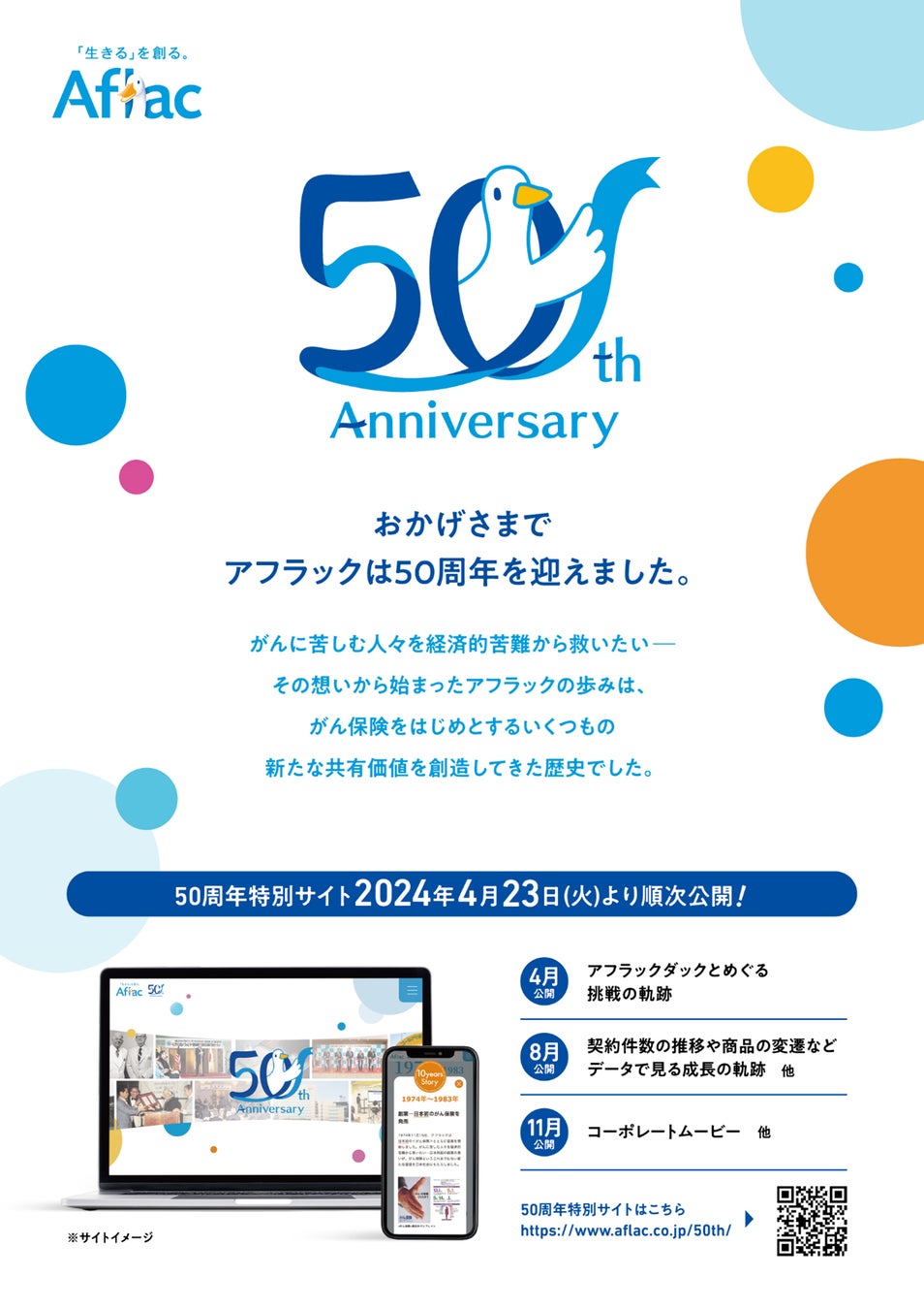 アフラック生命保険株式会社(代表取締役社長:古出 眞敏)は、今年11月15日に日本における創業50周年を迎えるにあたり、新たな共有価値の創造に向けたこれまでの取り組みなどをご紹介する「50周年特別サイト」をオフィシャルホームページ上で公開しましたのでお知らせします。