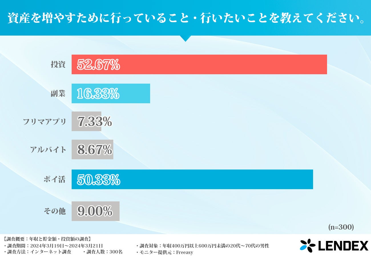 「資産を増やすために行っていること・行いたいことを教えてください。」という質問に対し、「投資(52.67%)」、「ポイ活(50.33%)」、「アルバイト(8.67%)」、「フリマアプリ(7.33%)」という結果になりました。
