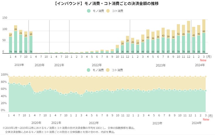 インバウンド消費の、モノ消費・コト消費の区分での決済金額推移、決済金額シェアの推移を可視化したコンテンツを追加しました。