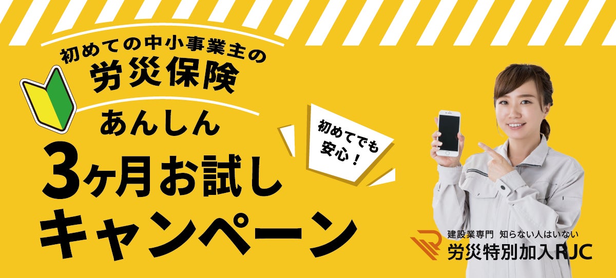 建設業専門の労災特別加入RJCでは、2024年4月1日(月)より、中小事業主の労災保険に加入を希望する方に向けて、「3ヶ月お試しキャンペーン」を開始いたしました。