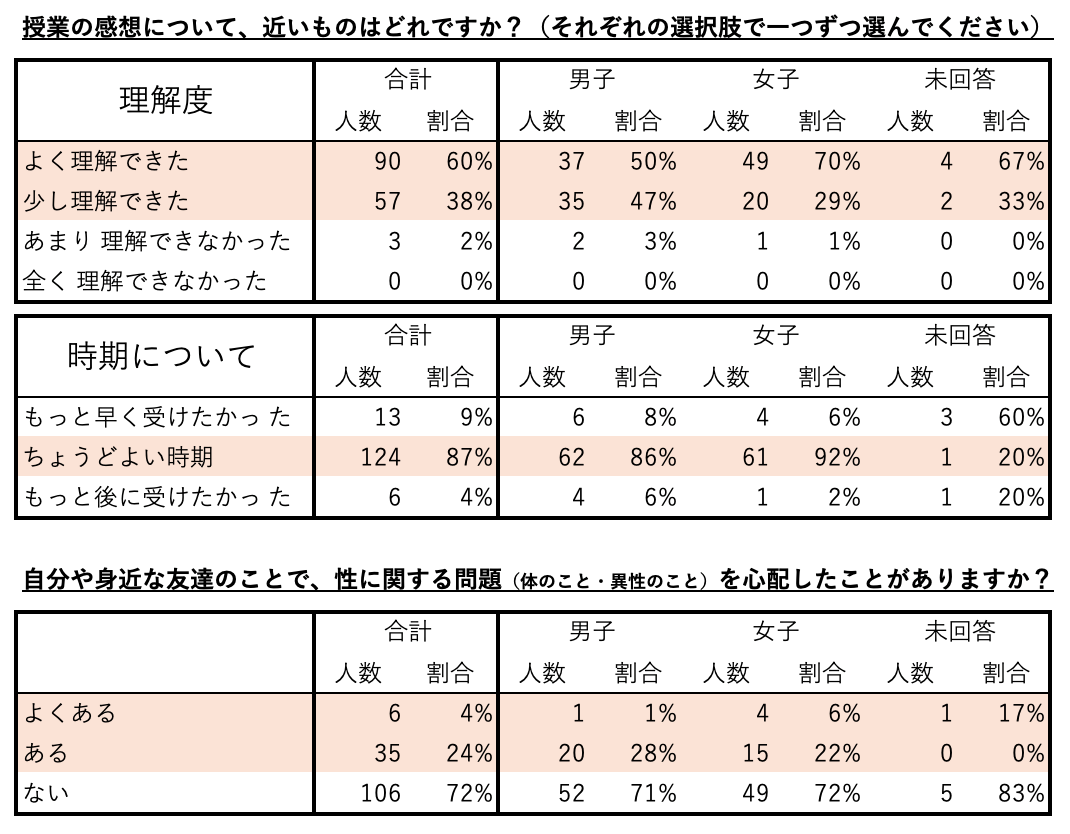 開催後のアンケートでは、参加生徒150名のうち、98%が講演の内容を「理解できた」と回答。また、87%の生徒が講演を「ちょうどよい時期に受けた」と評価し、性に関する相談を避けていた生徒が53%から12%へと大幅に減少しました。この講演が生徒たちにとって、正しい性の知識と自己・他者尊重の理解を深めるのに貢献したことが示されました。