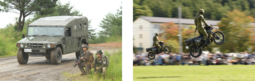・高機動車・偵察用オートバイの展示。実際に乗って写真撮影もできます!