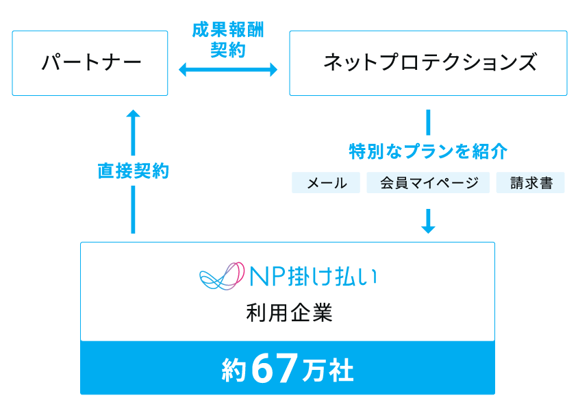 また「NP掛け払い」の利用企業に自社サービスを販売する企業は、年間67万社(※2)、毎月増加している「NP掛け払い」の利用企業に対して、初期コストをかけずに自社サービスを紹介することができます。