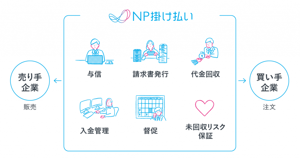 「NP掛け払い」は、企業間取引向けの後払い決済サービスです。当社が企業(売り手)と企業の顧客(買い手)の間に入り、買い手への与信から請求書発行、代金回収までの決済・請求業務全てを請け負い、未回収リスクを保証します。「NP掛け払い」の導入により、売り手は決済・請求業務をまるごとDX化し、かつコア業務に集中できます。また未回収リスクを保証することで経営基盤の安定化を図れます。加えて、従来の信用機関に依存しない独自の与信審査によって個人事業主に対しても与信通過率99%(※3)と柔軟に掛け売りが提供できるため、販路拡大・売上向上が見込めます。買い手は掛け払いを利用することでキャッシュフローの改善を期待できます。2023年現在、NP掛け払いの年間取扱高は1369億円、年間利用社数67万社と「日本で6社に1社が使っている決済(※4)」となりました。今後も「NP掛け払い」はサービス提供を通じて、あらゆるステークホルダーがより自由に挑戦や成長ができる環境づくりに貢献できるよう努めてまいります。