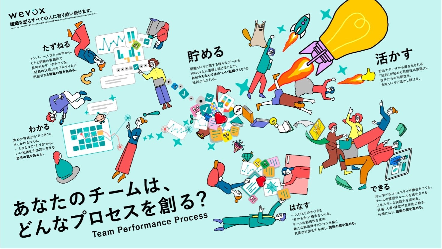 Wevoxは、エンゲージメントを軸にしたパルスサーベイで組織力向上を支援するプラット フォームです。エンゲージメントや組織カルチャーなど”組織の状態”を多角的に可視化・分析し、「たずねる→わかる→はなす→できる」といった組織力を「貯めて、活かす」ために必要なプロセスを促進します。