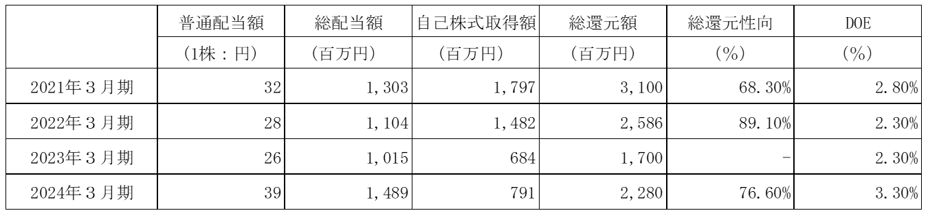 自己株式取得を含めた連結ベースの総還元性向50%以上の還元を行うことを基本方針とし、配当は株主資本配当率(DOE)2%程度を上回ることを目標とする。