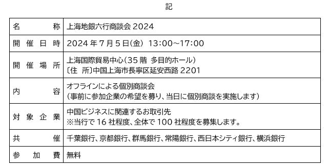 千葉銀行(頭取 米本 努)は、2024年7月5日(金)、地方銀行5行(京都銀行、群馬銀行、常陽銀行、西日本シティ銀行、横浜銀行)と共同で「上海地銀六行商談会2024」を開催します。