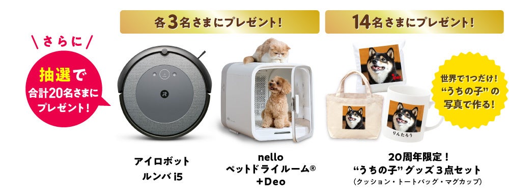 本キャンペーンは、期間中にペット保険にお申込みいただいたご成約者さま全員に、「サーティワン 200円デジタルギフト」をプレゼントします。また、抽選で各3名さまに人気のロボット掃除機やペットドライルームが当たるほか、抽選で14名さまに20周年限定の“うちの子”グッズ3点セットが当たります。
