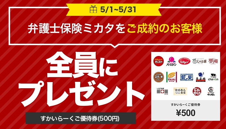 対象期間中に弁護士保険STATION経由で、ミカタ少額短期保険株式会社「弁護士保険ミカタ」の契約申込を完了し、ご契約が成立されたお客様全員に「すかいらーくご優待券(500円)」をプレゼントします。