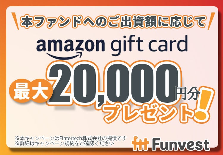 本ファンドへ出資していただいた投資家の皆様を対象として、出資額に応じて最大20,000円分のAmazonギフトカードをプレゼントするキャンペーンも併せて実施いたします。