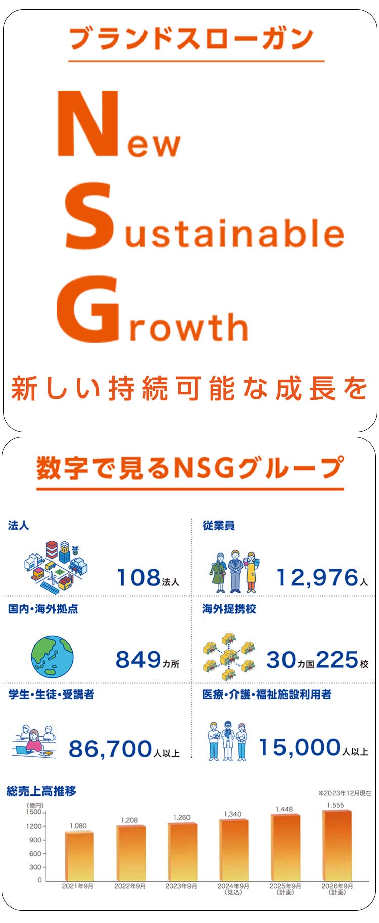 NSGグループの事業は、教育と医療・福祉・介護を中核としつつ、建設・不動産、商社、広告代理業、スポーツ、食・農、エンタテイメント等にも展開されています。同グループの原点は、1976年に設立された、学習塾などを運営する小さな民間教育機関でした。地域社会のニーズに応えて業容の拡大を続けた結果、108法人を傘下に置くグループへと成長し、1万2千人を超える規模の雇用を地域にもたらしました。