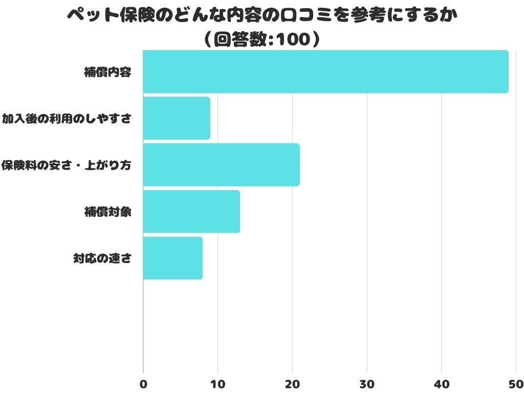 ペット保険のどんな内容の口コミを参考にするをアンケートにて調査したところ、1位は「補償内容」でした。