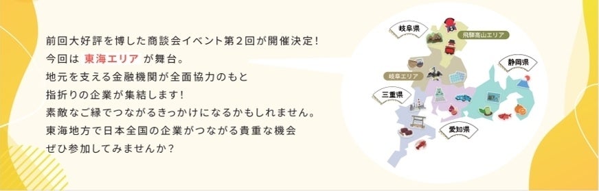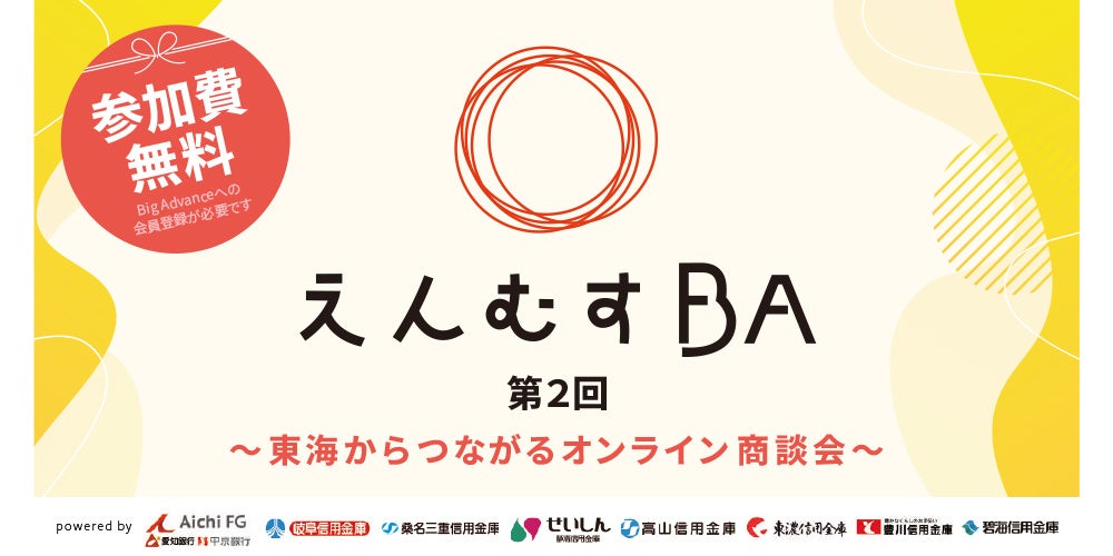 昨年大好評を博した大規模オンライン商談会イベント『えんむすBA オンライン商談会』の第2回目となり、今回は東海エリア(愛知県・岐阜県・静岡県・三重県)の地元を支える金融機関全面協力のもと、指折りの企業が集結します。