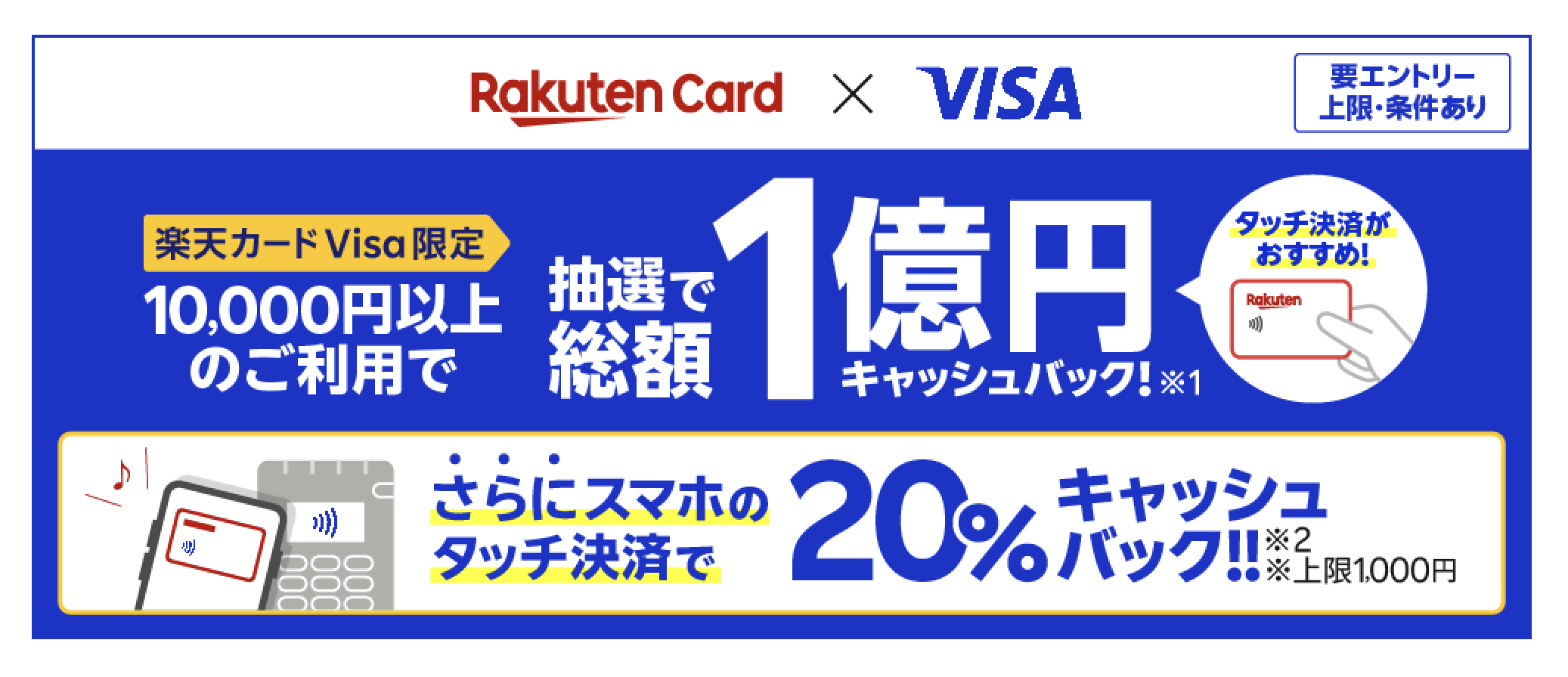 「楽天カード Visa限定!抽選で総額1億円キャッシュバック!さらにスマホのタッチで20%還元!」