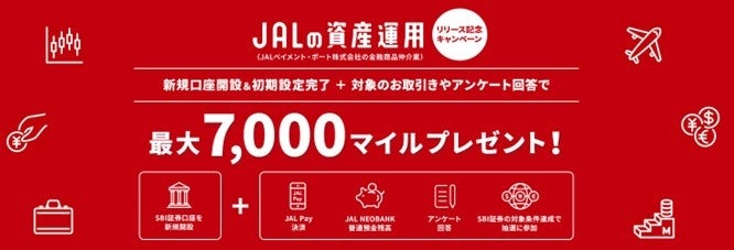 2024年5月14日(火)から2024年6月30日(日)の期間に「JALの資産運用」の口座開設や、JALペイメント・ポートが提供するさまざまな金融サービスのご利用、SBI証券の対象サービスのご利用で、JALのマイルがたまるリリース記念キャンペーンを実施します。