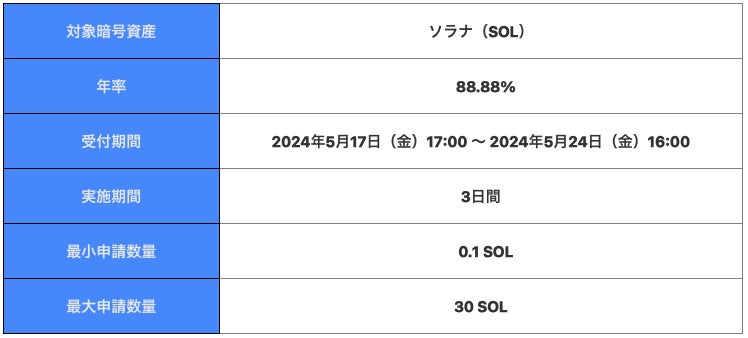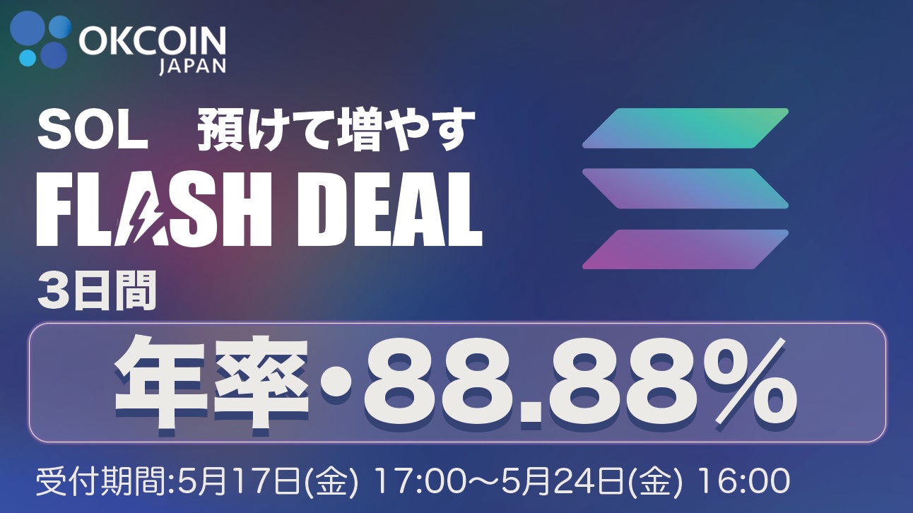 当社は、OKCoinJapan(暗号資産取引所)にて、ソラナ(SOL)のステーキングサービス(※)開始予定を記念し、「預けて増やす!3日間・年率88.88%」のFlash Deal(フラッシュディール)を開催いたします。