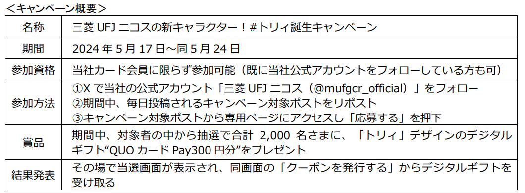 三菱UFJニコスは5月17日から5月24日まで、自社の新マスコットキャラクター「トリィ」のデビューを記念して、X(旧ツイッター)の当社公式アカウント「三菱UFJニコス(@mufgcr_official)」を「フォロー」しキャンペーン対象投稿を「リポスト」のうえ参加登録すると、抽選で合計2,000名に「トリィ」デザインのデジタルギフト“QUOカードPay(クオ・カード ペイ)300円分”が当たるキャンペーンを実施します。