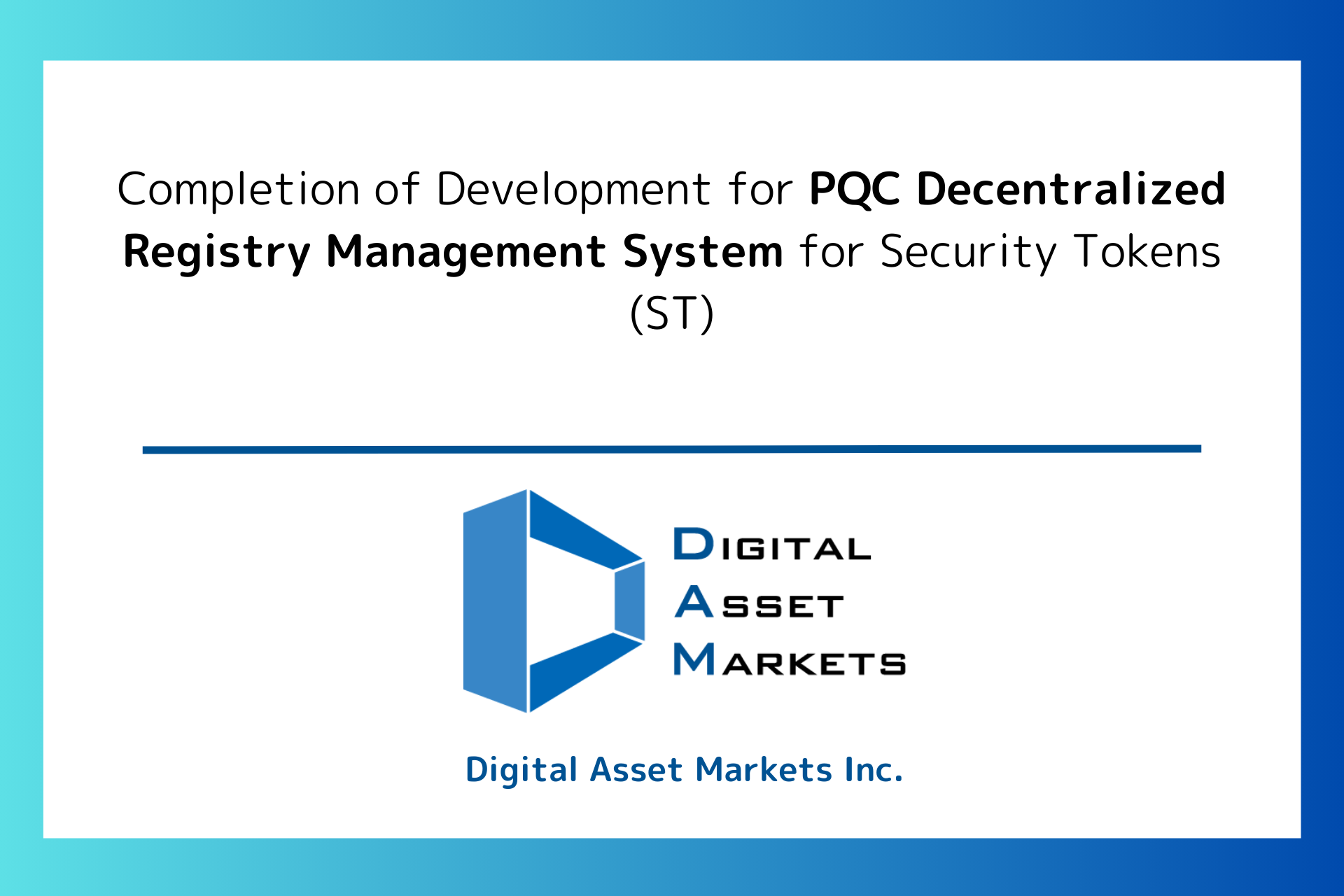 Digital Asset Markets Inc. (Headquarters: Chiyoda-ku, Tokyo; CEO: Kazuya Nishimoto, hereinafter referred to as “Digital Asset Markets”) is pleased to announce the completion of core technology development and the acquisition of related patents for a Post-Quantum Cryptography decentralized registry management system for security tokens (hereinafter referred to as “ST”).
