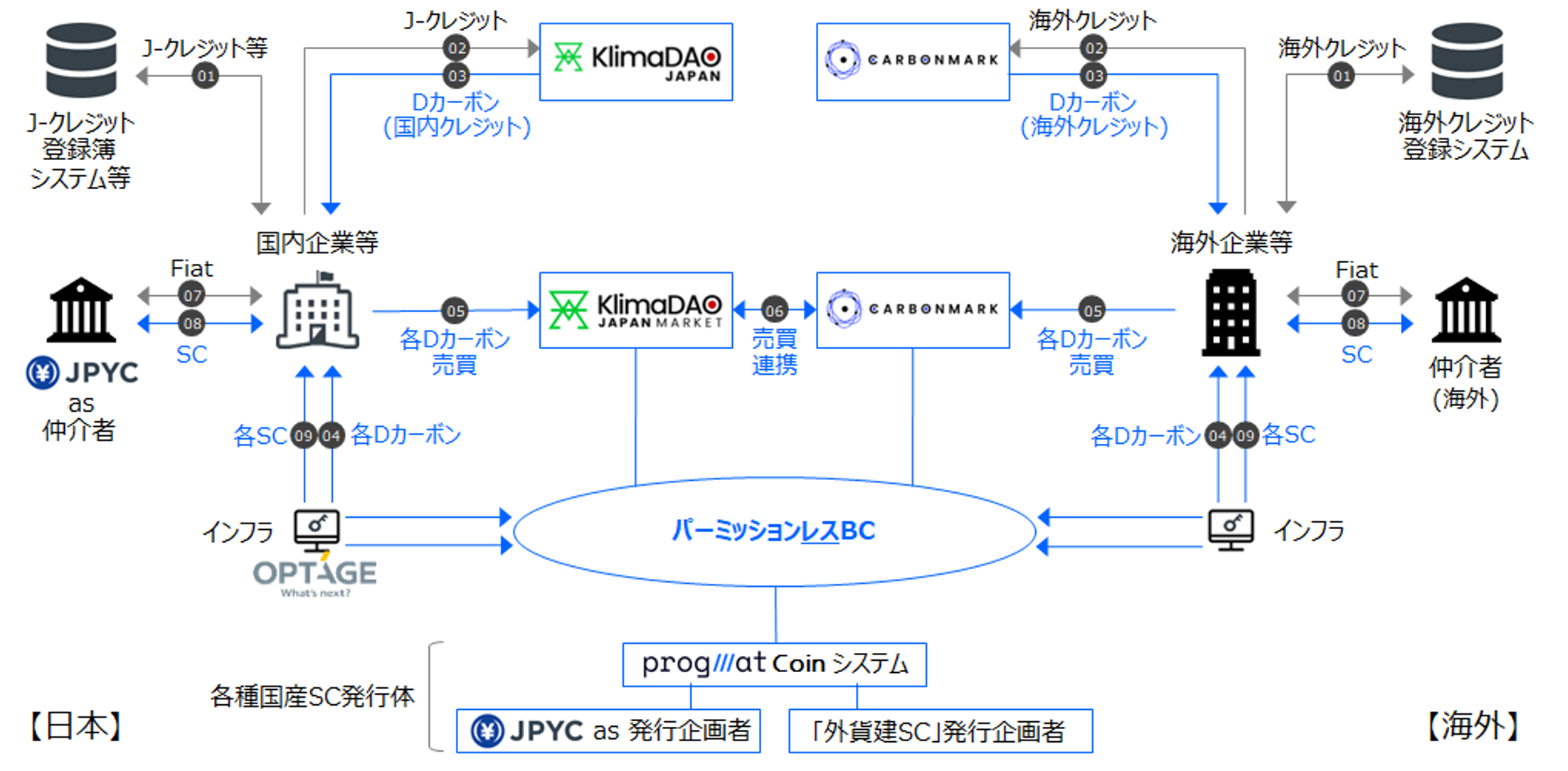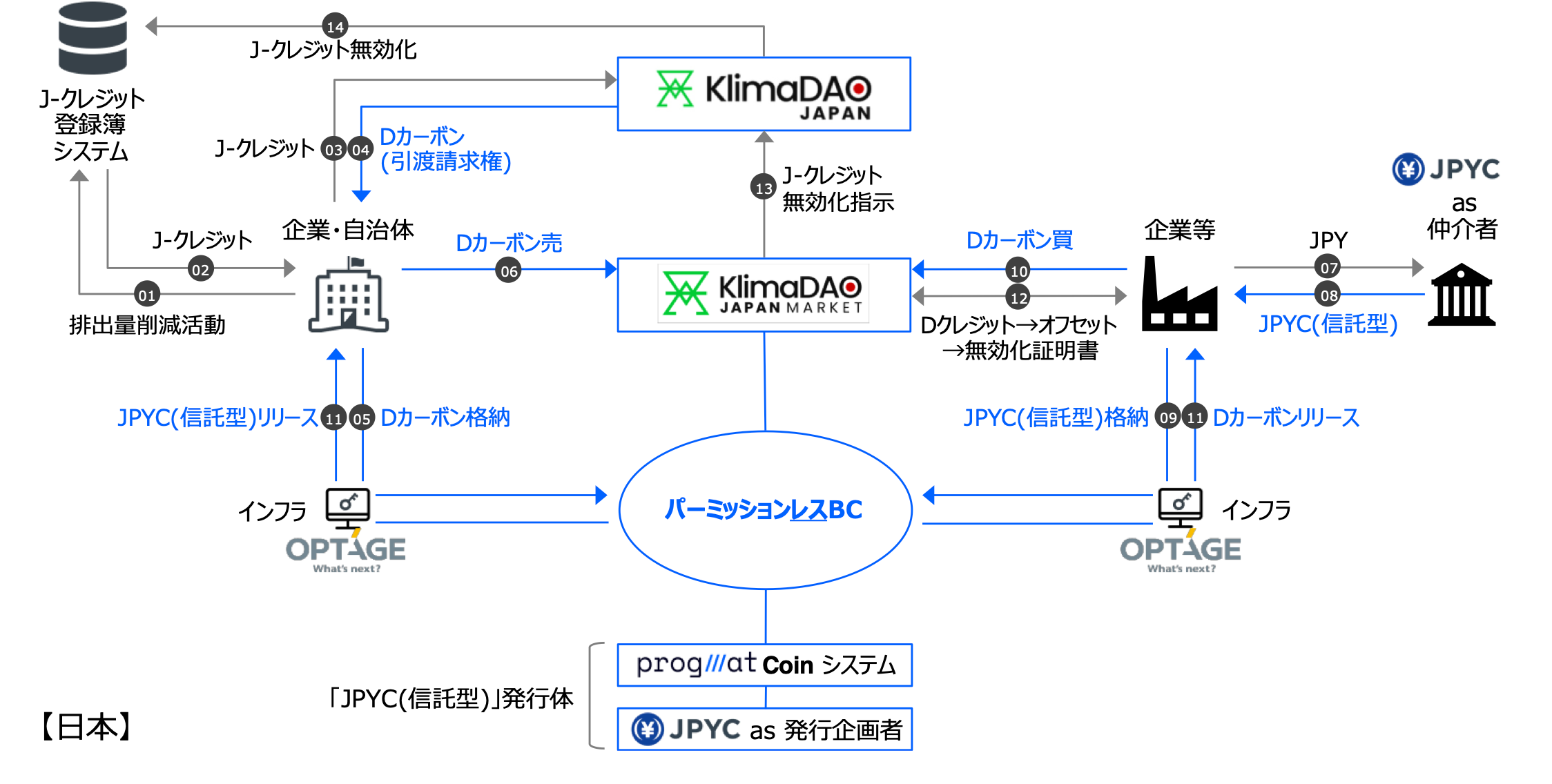 翔平、以下KlimaDAO JAPAN)、株式会社オプテージ(代表取締役社長:名部 正彦、以下オプテージ)は、「Progmat Coin(プログマコイン)」基盤を活用して発行されるステーブルコイン(以下SC)「JPYC(信託型)*1」を、デジタルカーボンクレジット(以下Dカーボン)決済に活用するための共同検討(以下本共同検討)を開始いたしました。