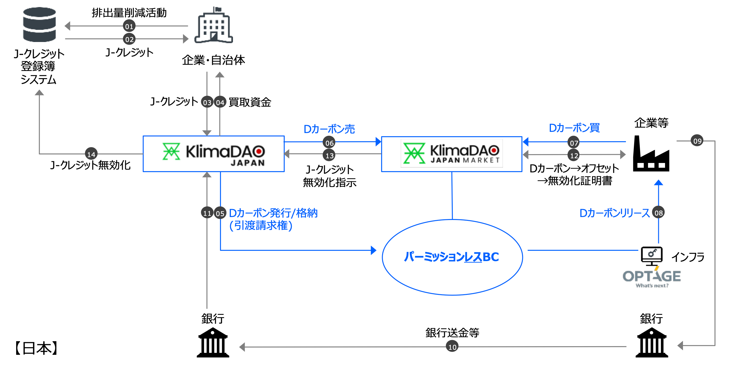 日本では、2023年10月より東京証券取引所がJ-クレジットの売買市場を開設したものの、現時点で売買金額は限定的で、VCのマーケットプレイスは存在はしているものの、まだ開始したばかりで、流動性もそれほど高くありません。そのような中でKlimaDAO JAPAN は、既にグローバルで展開されているDカーボンのマーケットプレイス「Carbonmark」の基盤を利用し、J-クレジットおよび日本発のVCに対応したDカーボンのマーケットプレイス「KlimaDAO JAPAN MARKET」を新たに開設し、段階的にグローバルベースの流動性を提供する計画です。Dカーボンは、KlimaDAO JAPAN が企業・自治体から買い取ったJ-クレジット等に対する引渡請求権を、グローバルにアクセス可能なパーミッションレスブロックチェーン上のトークンとして発行するものです。当該ブロックチェーンにアクセスしDカーボンを管理するために必要な企業向けインフラをオプテージが提供し、銀行送金等での資金決済とすることで、まずは企業が取引参加しやすい環境で市場開設する想定です。