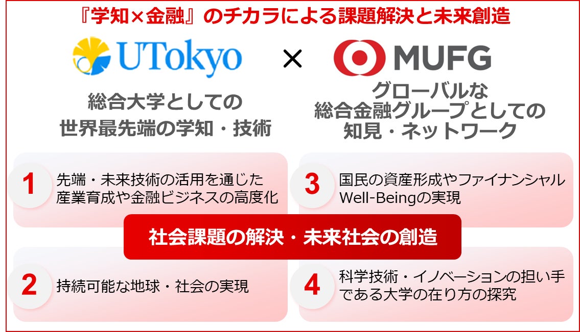 本協定の目的は、東京大学とMUFGがそれぞれ持つアセットを融合させ、多様な学知や技術、人材の相互循環により、研究成果の社会実装や人材育成など、既存の枠組みにとらわれないさまざまな価値を創出することです。当面の具体的な連携協力事項は下記の4項目です。